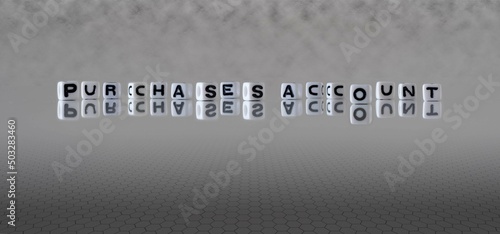 purchases account word or concept represented by black and white letter cubes on a grey horizon background stretching to infinity