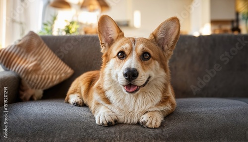 Purebred Corgi Dog Lounging on Sofa in Warm Living Room, Capturing Serenity and Beauty in a Cozy Interior Space with Elegant Decor