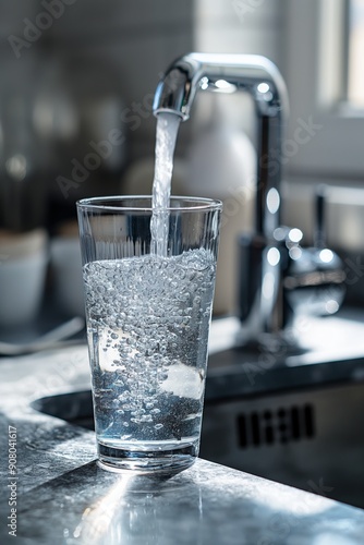 Purified water pouring into a glass from a tap, creating bubbles and a refreshing flow.