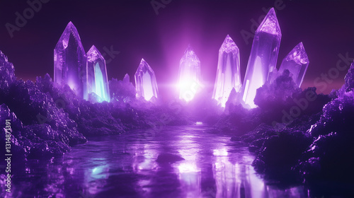 Purple Crystal Cave with Glowing Center, Fantasy Landscape