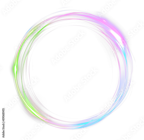 Purple, green and blue Neon glowing fantasy circular glow. Round shaped radial motion swirl. Transparent background PNG.