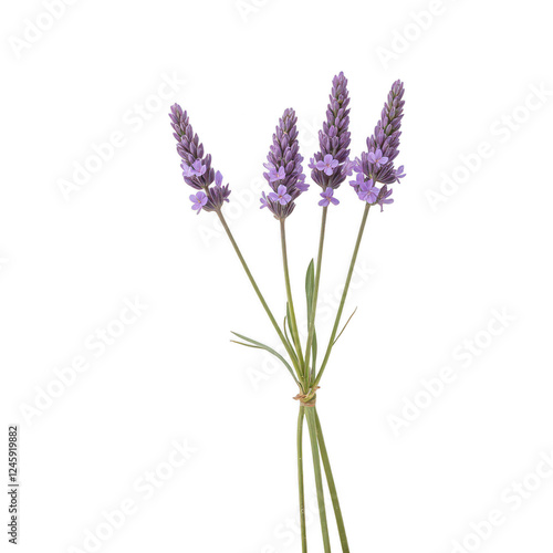 Purple lavender sprigs, vibrant green stems, aromatic floral display, perfect for wellness themes and natural beauty products. Isolated on white background or PNG