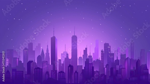 Purple twilight descends on a minimalist city: Iconic silhouettes and whimsical design in a serene skyline illustration.