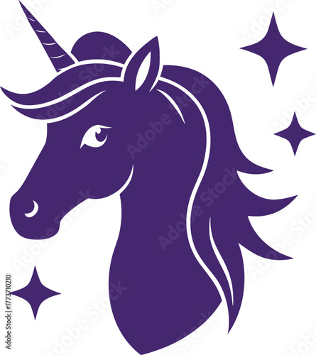 Purple unicorn head with stars on a white background
