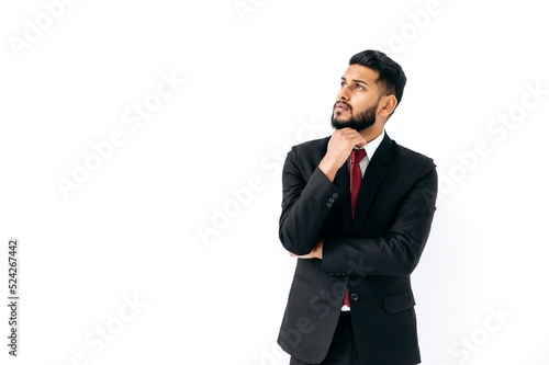 Puzzled thoughtful elegant influential arabian or indian man in formal suit, stand on isolated white background, pensively looking away, thinking, planning, dreaming. Copy-space for your presentation