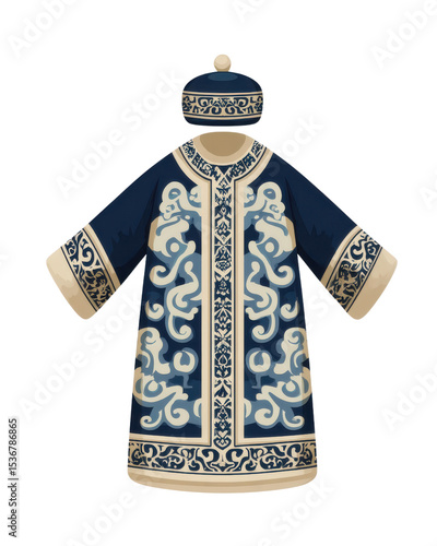Qing Dynasty Robe: The intricate artwork showcases a Qing Dynasty robe, adorned with traditional Chinese symbols and patterns, and complemented by a matching hat, all set against a clean presentation.