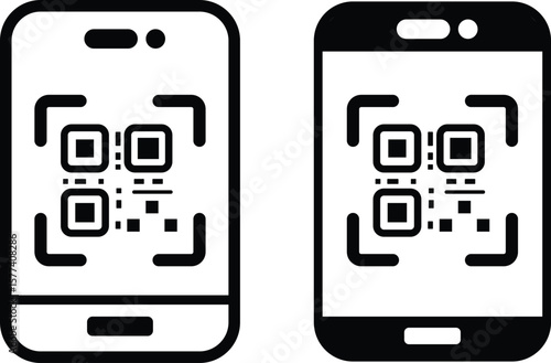 QR code scan icon with smartphone. Mobile phone scanning qr-code vector illustration. Hand holding a phone with scanner symbol