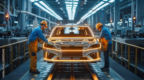 quality assurance team reviewing the automated painting process of vehicles in an automotive factory.