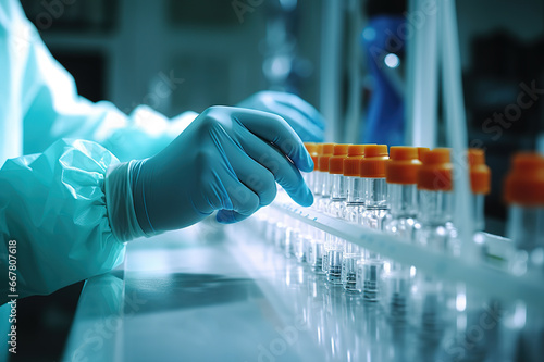 Quality Control in Pharmaceutical Manufacturing Hand with Sanitary Gloves Inspecting Medical Vials on Production Line. created with Generative AI