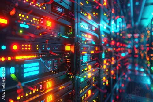 Quantum computer in a futuristic data center, glowing cables, advanced technology, vibrant colors, photorealistic