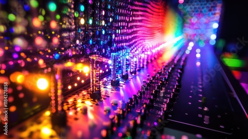 Quantum sensor array emitting multicolored lights, surrounded by a dark and futuristic laboratory