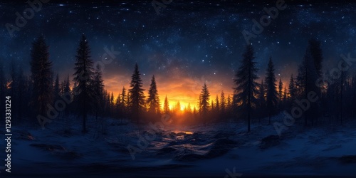 Quiet misty forest at dusk with silhouettes