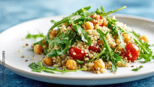 Quinoa salad with chickpeas, arugula, and tomatoes. A vibrant, healthy-looking dish of quinoa, chickpeas, cherry tomatoes, and arugula, presented on a white plate. Fresh greens,