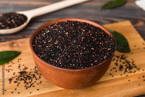 quinoa seeds in bowl and spoon on colored background. Healthy kinwa in small bowl. Healthy superfood