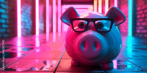 Quirky Piggy Bank with Glasses in a Neon-Lit Cyberpunk Setting