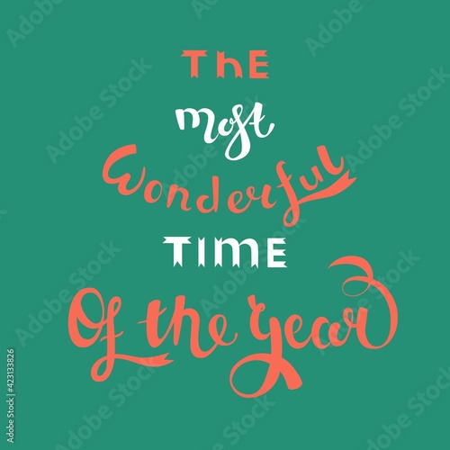 Quote the most wonderful time of the year. Isolated on dark background with lights. Vector illustration. Motivation phrase. New year and Christmas celebration. Poster, print, card design.