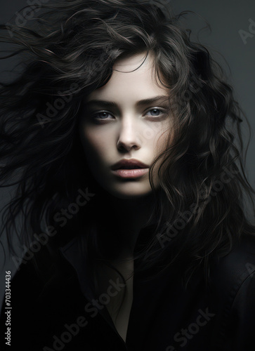 Radiant Beauty: Captivating Portrait of a Young Woman with Dark Curly Hair, Exuding Elegance and Glamour against a White Studio Background