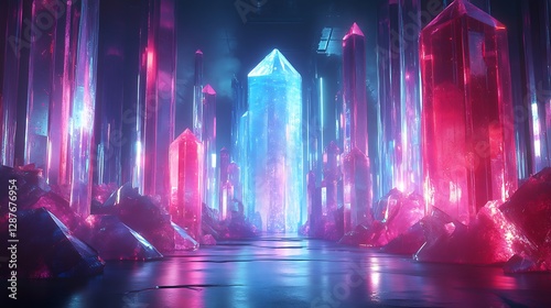 Radiant crystal-inspired network glowing softly, interconnected geometric shapes representing economic data, vibrant hues of cyan and magenta blending smoothly,