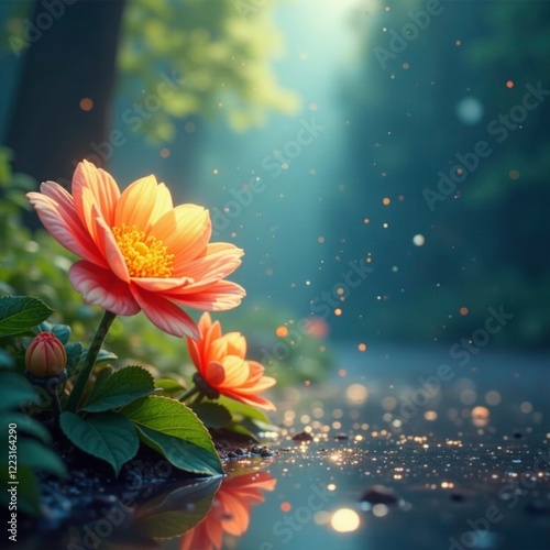 Radiant flowers blooming in a pool of glittering fairy dust, whimsical, dust