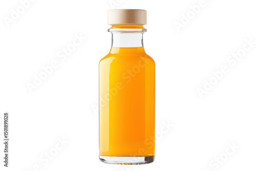 Radiant orange liquid in a glass bottle capped with wood against a stark white background