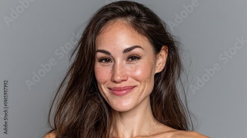Radiant woman with freckles smiling confidently at camera.