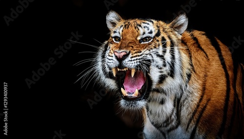 Raging Tiger in Intense Black Backdrop, Sharp Teeth Bared, Showcasing Rich Textures and Vibrant Eyes Against a Dark Canvas, Stirring Primal Energy.