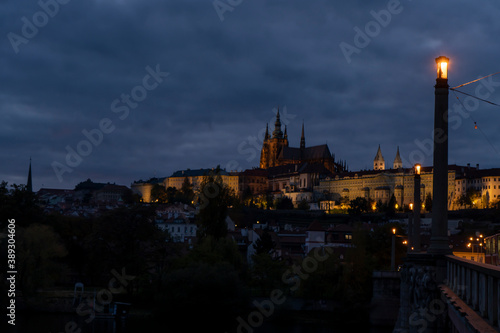 railings and sidewalk for pedestrians and street lights and in the background Prague Castle and St. Vitus Cathedral at night in the center of Prague