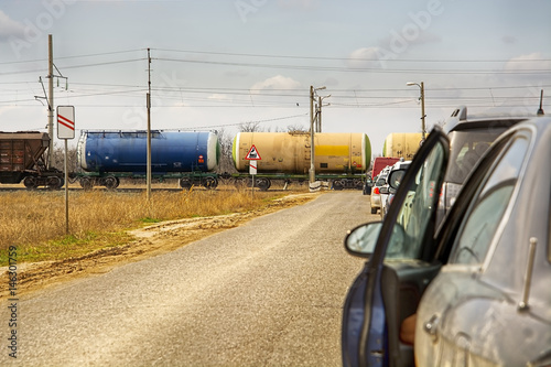 railway crossing. cars at the intersection