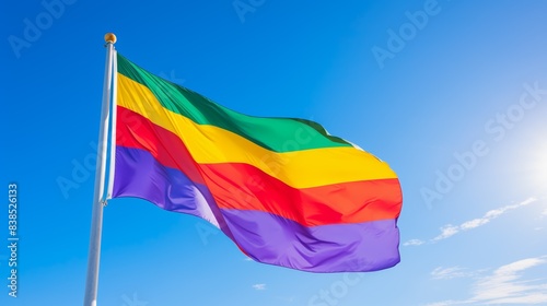 Rainbow flag waving, clear sky background, vibrant colors, full frame