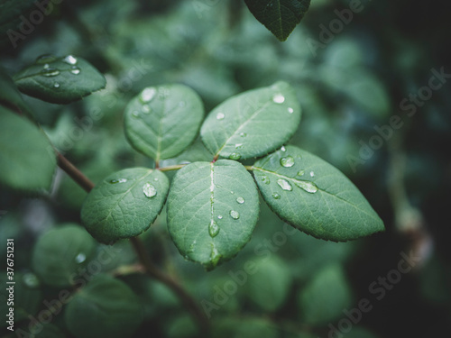 Raindrops on a branch of a rose bush in the garden after the rain.