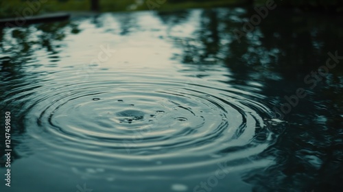 Raindrops ripple in puddle, outdoors, nature background, calm scene