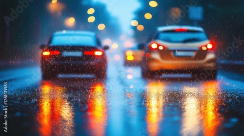 Rainy City Street Cars Blurred Evening