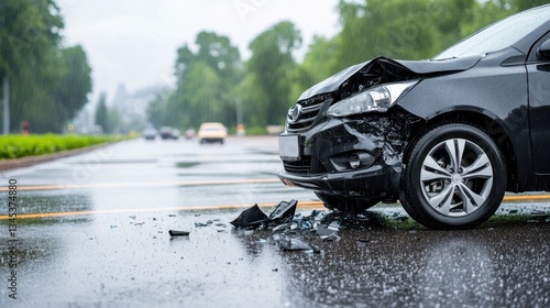Rainy Day Car Accident Scene with Damaged Vehicle on Wet Road Surrounded by Green Trees and Blurred Traffic