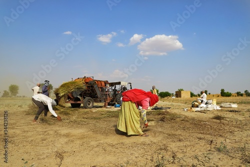 rajasthan,india.29april,2020,india family harvesting crops in daylight