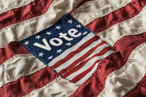 Rally in the elections in the United States. A red, white, and blue American flag with the word Vote on it
