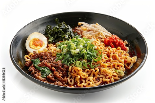 Ramen with accompaniments in a black plate, looks delicious on a clean white background, typical japanesse food