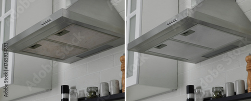 Range hood with mesh filters in kitchen. Before and after cleaning, collage
