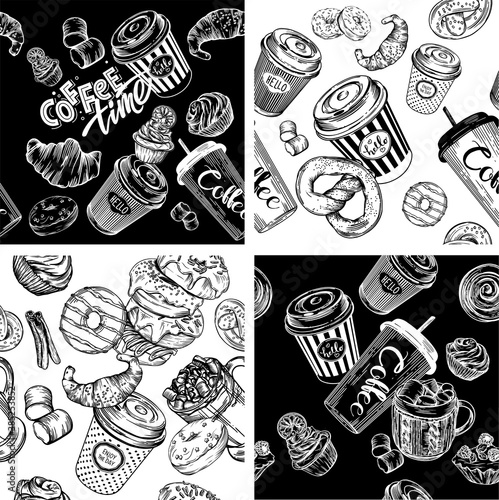 Raster seamless prints. Coffee and baking prints. Patterns for coffee shops and pastry shops. Coffee, pastries, muffins, croissants, doughnuts. Black and white illustration of food and drinks line.