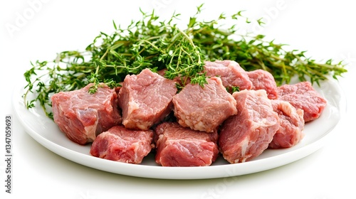 Raw Beef Cubes Surrounded by Fresh Thyme on a White Plate Ready for Cooking