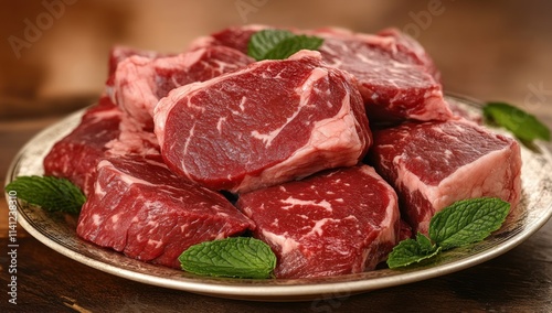 Raw Beef Steaks with Mint Garnish on Silver Plate