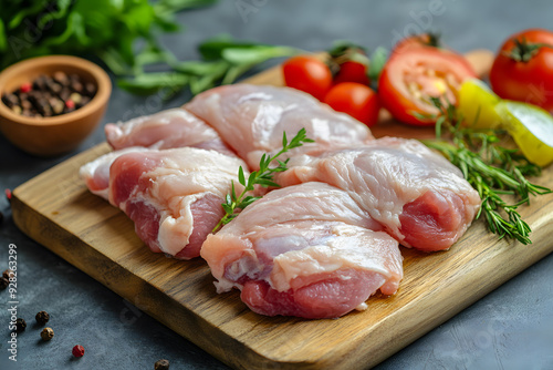 Raw chicken meat cutting on a wooden board commercial advertising photo