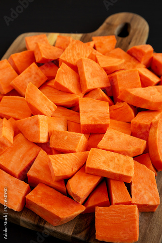Raw Chopped Sweet Potatoes on a Cutting Board, low angle view.