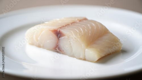 Raw Cod Fillet on White Plate Closeup raw fish seafood