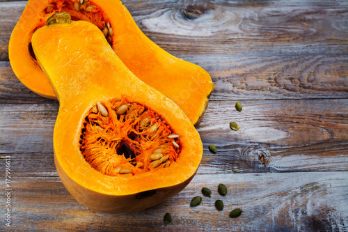 Raw cut butternut pumpkin on kitchen table. Space for text