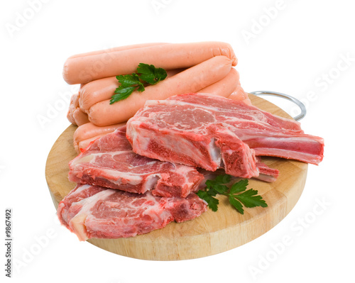 Raw Lamb chops and Beef Sausages Isolated over white background