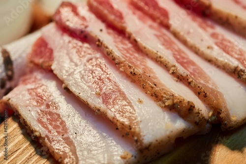 Raw lard, grated with salt and spices. Slicing meat on a wooden board