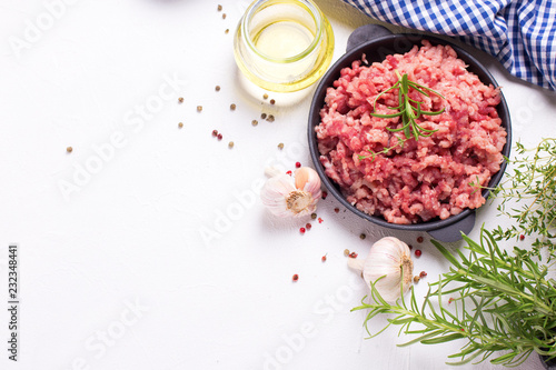 Raw minced meat in bowl with ingredients for cooking