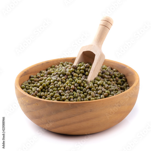 Raw mung bean or green bean in a wooden bowl isolated on white background