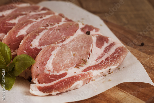 Raw pork meat with spices, wooden cutting board. Food Cooking Ingredient. Top view with copyspace.