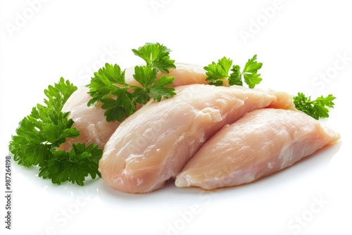 Raw skinless and boneless chicken breast meat with parsley garnish isolated on white , ai